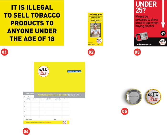The selected 'No ID, No Sale!' retail materials can be accessed in the Download Section along with supplementary extras. Retailers can order one pre-printed, full 'No ID, No Sale!' Retail Pack free of charge. If more than one pack is ordered, retailers have to cover postage payment.